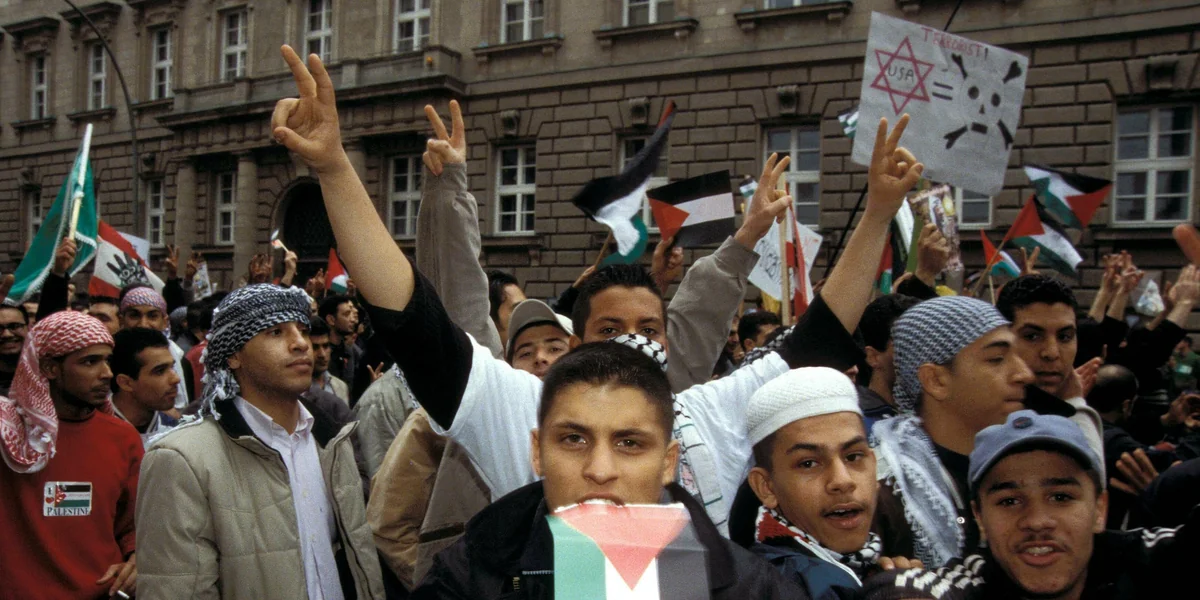 V om Alexanderplatz am Berliner Dom vorbei zum Leipziger Platz demonstrierten 11.000 Menschen, unter ihnen Mitglieder der Grünen und ein Palästinenser aus Neukölln, der seinen Kindern Sprengstoffgürtelattrappen umgebunden hatte. Es war Samstag, der 13. April 2002, ein halbes Jahr nach 9/11, zu Beginn der israelischen Militärreaktion auf die „Zweiten Intifada“, es war eine Demo unter dem Motto „Solidarität mit Palästina“.
