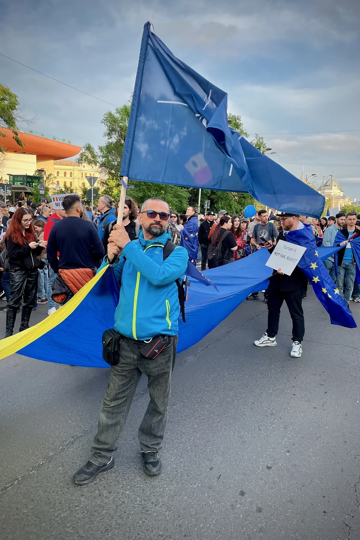 Ein Mann in Sportschuhen und blauer Funktionsjacke schwenkt eine Nato-Flagge. Was er davon hält, dass Simion meint, Rumänien solle „neutral“ sein? „Er ist ein Extremist“, sagt er. „Ein Misogynist, ein Rassist, ein Faschist.“ Der Mann hört gar nicht mehr auf. Für die Demo sei er extra angereist, erzählt er.