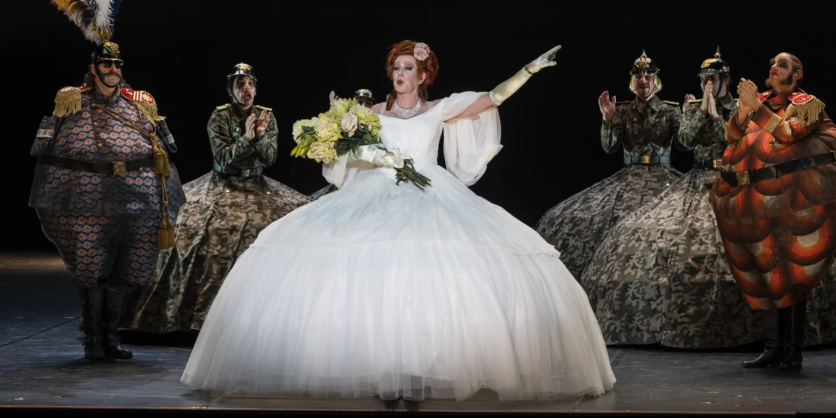 Musik ist selten in sich selbst komisch. Sogar in Mozarts Komödien sind die Situationen und Personen komisch, nicht die Töne. In Offenbachs „Großherzogin von Gerolstein“ ist es umgekehrt. Die Handlung ist ein kompletter Unsinn. Eine alte Dame besucht ihre Soldaten auf der Suche nach einem Liebhaber. Lustig sind daran nur die Lieder zwischen dem albernen Gerede, wild durcheinander, mal tschingderassabumtätä, dann selig schwelgend oder in Gruppen, die im Rossini-Groove zusammenkommen.