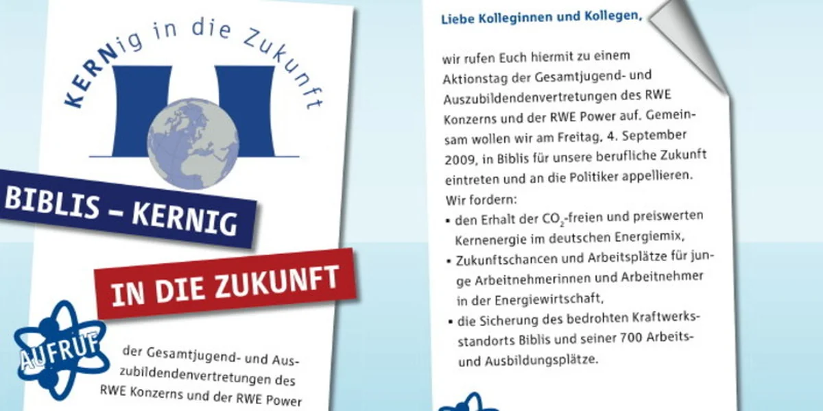 Die Forderungen der jungen Menschen stehen schon mal fest. "Wir fordern den Erhalt der CO2-freien und preiswerten Kernenergie im deutschen Energiemix", heißt es im RWE-Flyer.