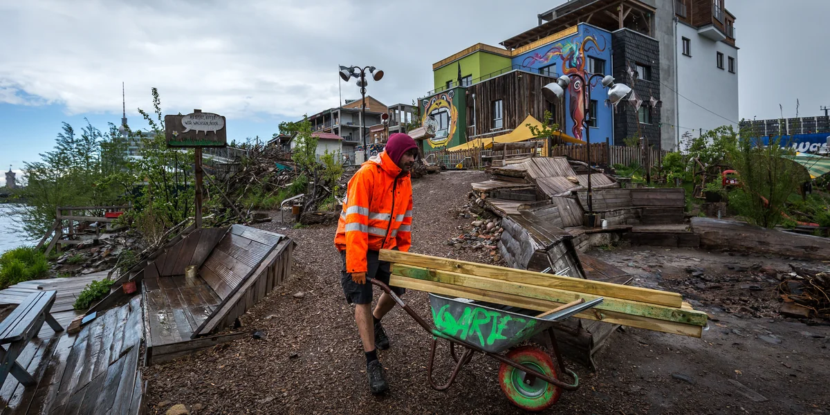 Am Ende ging es einfach nicht mehr. Da sind Mario Husten und Juval Dieziger aufs Dach gestiegen und haben die schwarze Fahne gehisst. Seitdem weht über dem Holzmarkt an der Spree der Schriftzug „Halbmast“. Als Zeichen der Trauer, dass etwas gestorben ist. Dass neben ihrem Hippiedorf ein Nullachtfünfzehnturm hochgezogen werden könnte. Dass sich die Mieter dann über den Lärm der Clubs und der Nachtschwärmer beschweren. Dass am Ende sogar das Dorf verschwinden könnte. „Wir wollen nicht, dass da etwas hinkommt, das mit uns nichts zu tun hat“, sagt Juval Dieziger. In seiner Stimme liegt Verbitterung. „Wir sind ausgebrannt.“