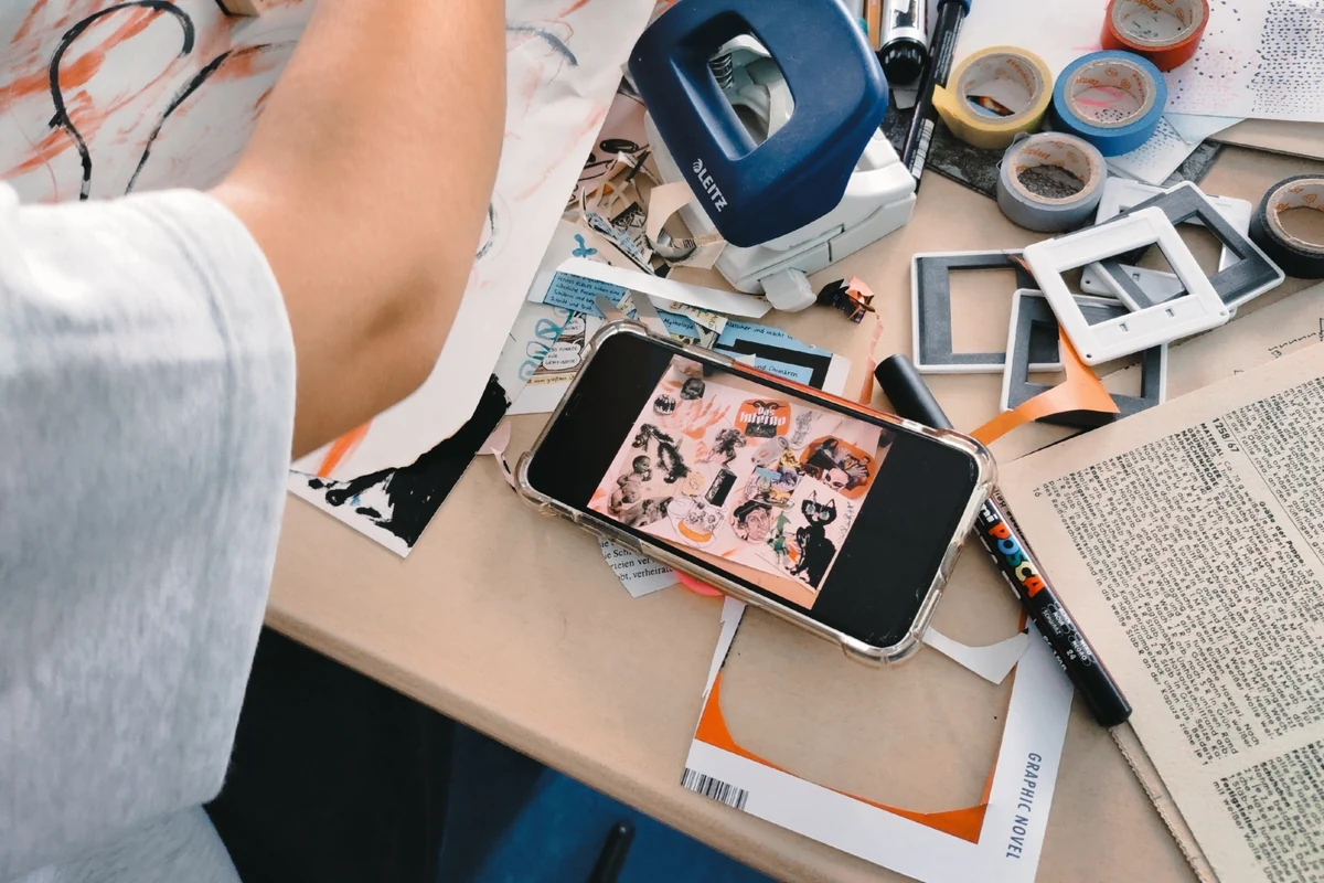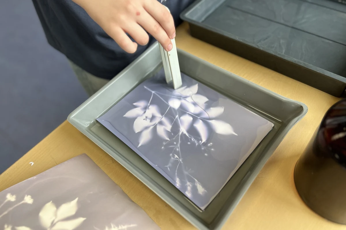 Wenn es in dem kahlen Raum nicht die Kunst gäbe, könnte man sich hier schnell verloren vorkommen. An der Wand hängen Bilder, auf denen Handabdrücke und Pflanzenmotive auf blauem Papier zu sehen sind – eine alte fotografische Technik, die sich Eisenblaudruck (oder in der Fachsprache „Cyanotypie“) nennt. Auch Keramikfiguren sind ausgestellt: ein Seestern und ein Seepferd, ein großer und ein kleiner Hase, eine blau-gelbe Vase in den Farben der Ukraine. Auf einem Tisch liegen verstreut Polaroidfotos, auf denen lachende junge Frauen zu erkennen sind. „Self-exploration through the lens“ steht darunter.