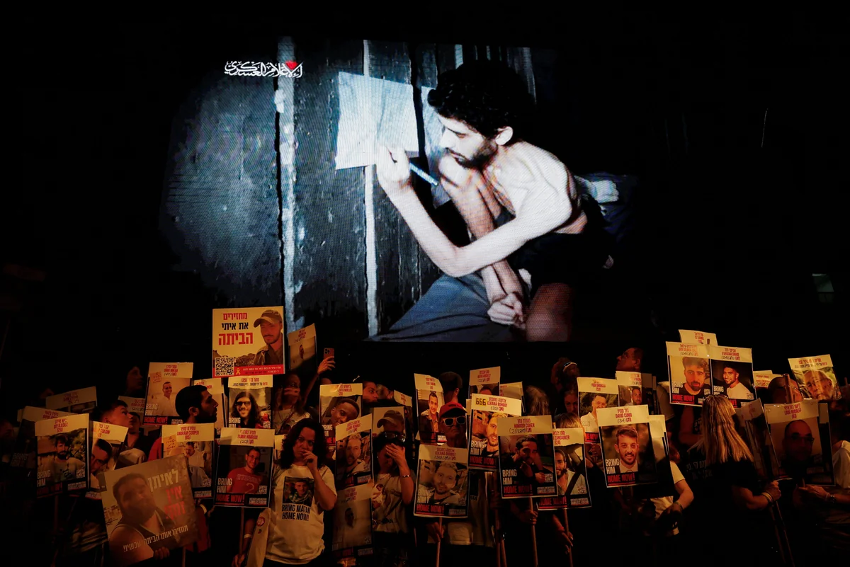 Am Freitag veröffentlichte die Hamas, die Gaza kontrolliert, ein weiteres Geiselvideo. Evyatar David, ebenfalls am 7. Oktober vom Nova-Festival entführt, sieht darin aus wie kaum mehr als ein Skelett. Im Video muss er sein eigenes Grab schaufeln. Er zeigt auf eine Art selbst gebastelten Kalender an der Wand des Tunnels, in dem er gefangen gehalten wird, worauf er seine knappe Ernährung – lediglich Linsen und Bohnen – dokumentiert. An einigen Tagen bekomme er nichts zu essen. Dem israelischen Premierminister Benjamin Netanjahu sagt er: „Ich fühle mich im Stich gelassen.“