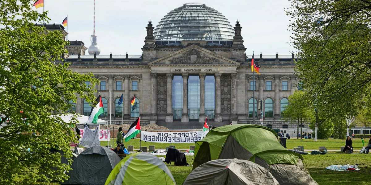 Seit knapp zwei Wochen zelten unter dem Motto „Besetzen gegen Besatzung“ propalästinensische Aktivist*innen vor dem Reichstag. Sie veranstalten Workshops, Kundgebungen, zeigen Dokumentarfilme. „Aktuell sind wir rund 40 Menschen, abends bis zu 100“, erzählt Ethan. Er ist seit Samstag im Zeltlager. Gegründet hatte sich das Camp im Vorfeld des Palästina-Kongresses Mitte April, den die Polizei bereits am ersten Tag aufgelöst und verboten hatte.