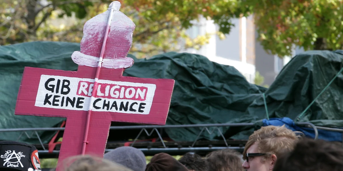 Abgeschirmt durch die Polizei, schreitet eine Prozession zu Kirchenmusik vorbei. Zwei Menschen pro Reihe, im Arm je ein großes, weißes Kreuz. Sie schreiten ein bisschen schneller, da kommen wieder Kondome geflogen. „Fundamentalismus raus aus den Köpfen!“, intoniert der Sprechchor vom Straßenrand.