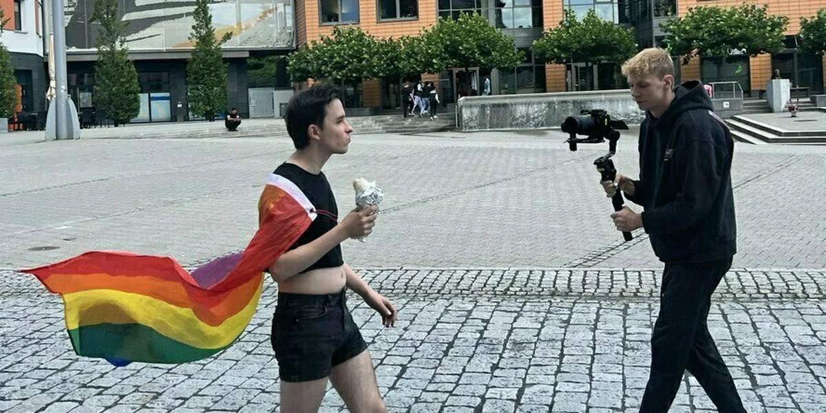 Wir wurden nur heftig angehupt, als wir das erste Mal eine Regenbogenfahne rausholten. Als wir vor dem Rathaus standen, dauerte es keine halbe Stunde, bis zwei Autos am Rande parkten, deren Fahrer die Scheinwerfer anwarfen und uns filmten. Während des ganzen Drehs standen wir unter Beobachtung und unter wiederholter Beschimpfungskanonade.