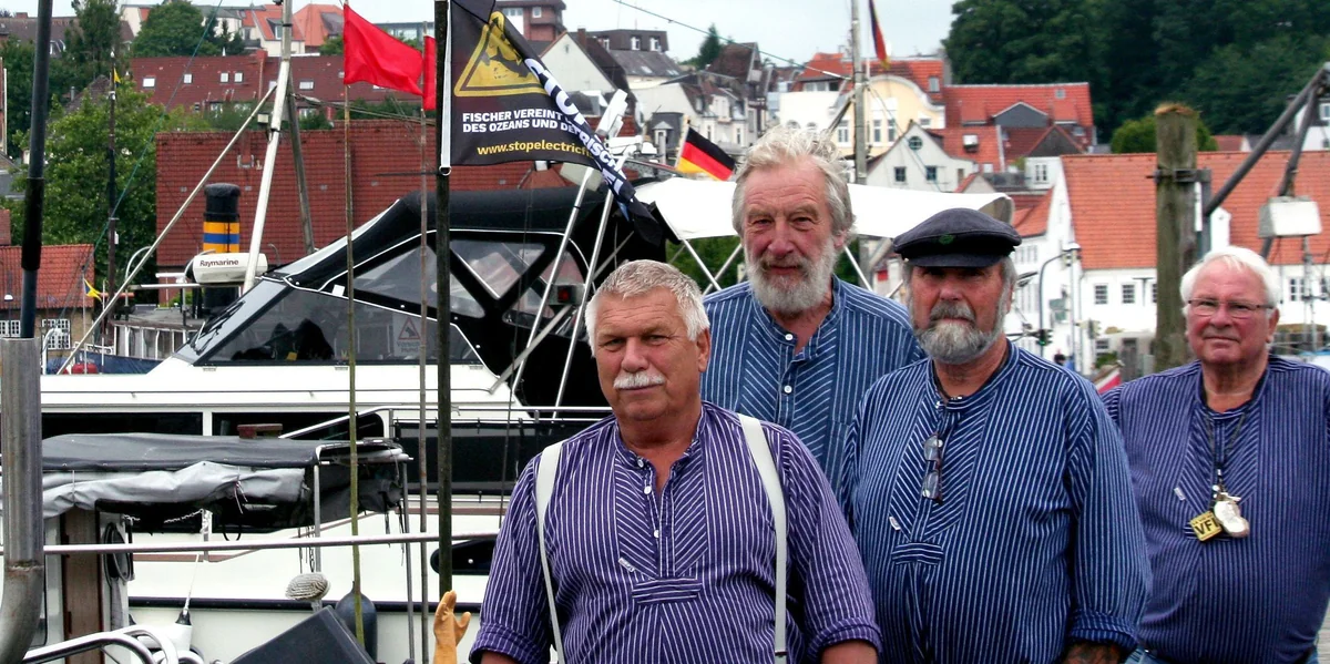 Der Protest der Flensburger Fischer beginnt geruhsam: „Setzt euch man, kost’ das gleiche“, lädt Rudi, einer der Männer in blau-weißer Leinenbluse, die zur Demo angereisten Gäste an den Holztisch vor der Steganlange am Hafen. Aber hinter der gelassenen Fassade sind die Fischer sauer. Sie kämpfen mit KollegInnen in elf Häfen in ganz Europa und mehreren Umweltschutzorganisationen gegen die Methode, Seetiere mit elektrischen Schocks aufzuscheuchen.