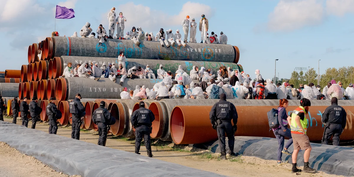 Nach rund zwei Stunden bewegt sich der Demozug auf den Hafen von Mukran zu, rechts unterhalb der Brücke liegen die Pipelinerohre, bereit, in der Ostsee versenkt zu werden. Die Heringe werden langsam nervös und gruppieren sich. Dann bricht der erste Teil der Ende-Gelände-Gruppe aus dem Demozug aus, sie stürmen das Hafengelände. Die zweite Gruppe bricht aus, die weißen Maleranzüge rennen auf Andrea Kähler zu, die sich an den Straßenrand rettet. Ihren Schwarm hat sie verloren.