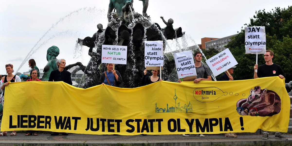 Etwas bieder und brav wirkt die Kundgebung, deren Motto ein gelbes Transparent ziert: „Lieber wat jutet statt Olympia!“ Auf einer der kleinen Parolentafeln steht „Spartakiade statt Olympia“. Judith Demba aber meint es ernst. Die ehemalige Grünen-Abgeordnete, die zusammen mit Harald Wolf von der PDS 1993 den Anti-Olympia-Protest im Abgeordnetenhaus anführte, ist davon überzeugt, auch diesmal erfolgreich zu sein: „Wir sind mehr geworden“, sagt sie, „und wenn der Sommer vorbei ist, werden wir noch mehr. Berlin braucht vieles, aber keine Olympiabewerbung.“