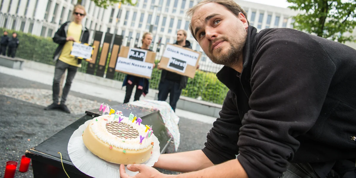 AktivistInnen trugen deshalb am Donnerstag einen schwarzen Sarg vor das Bundesinnenministerium und stellten Grablichter auf. Zudem platzierten sie einen Kuchen mit der Aufschrift „Happy Birthday“ auf dem Sarg und präsentierten zwei symbolische Geschenkpakete mit den Aufschriften „R.I.P. Jamal Nasser M.“ und „Glückwunsch Horst“.
