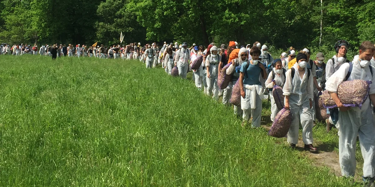 Einen Tag früher als zunächst angekündigt machten sich die KlimaschützerInnen am Freitag Mittag auf den Weg, aufgeteilt in drei Gruppen, überwiegend gekleidet in weiße Schutzanzüge und ausgerüstet mit Staubschutzmasken, Strohsäcken und Transparenten. Wegen der großen Beteiligung aus anderen Ländern wird überwiegend englisch gesprochen. „What do we want? Climate justice!“, rufen sie auf ihrem kilometerlangen Marsch. Und: „Leave the coal in the ground!“