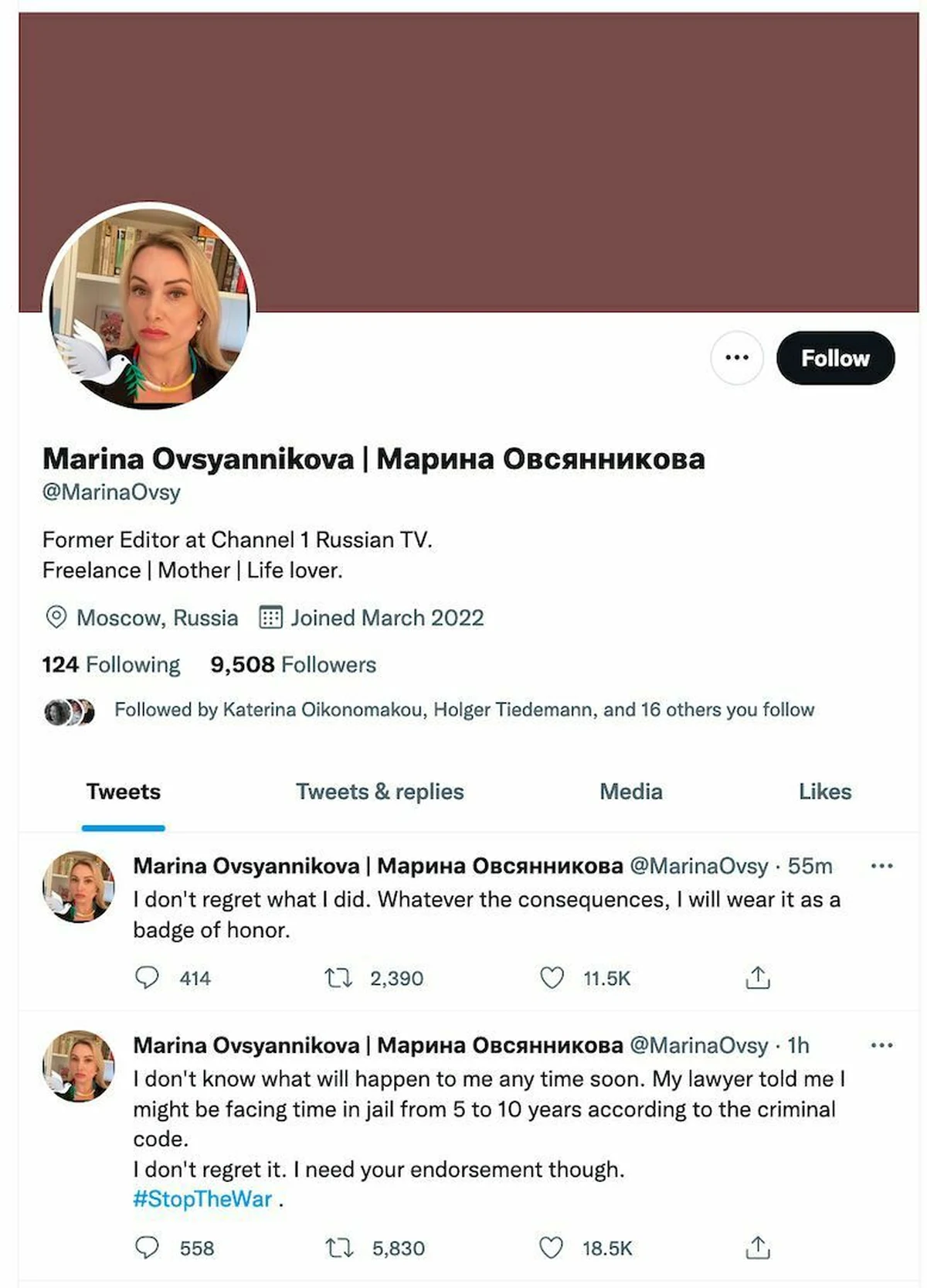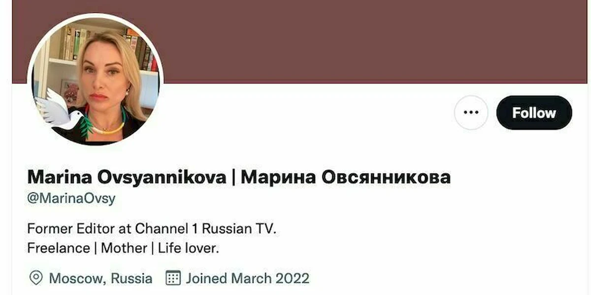 Die TV-Redakteurin ist schlagartig bekannt geworden, weil sie am Montag in den Abendnachrichten im staatlichen Fernsehen ein Protestschild gegen den Krieg in der Ukraine hochhielt. Viele verfolgten online, was danach mit ihr geschah. Am Dienstag meldete sie sich offenbar wieder selbst zu Wort, als @MarinaOvsy bei Twitter, sie schreibt auf Englisch plakative Sätze wie: „Ich bereue nicht, was ich getan habe.“