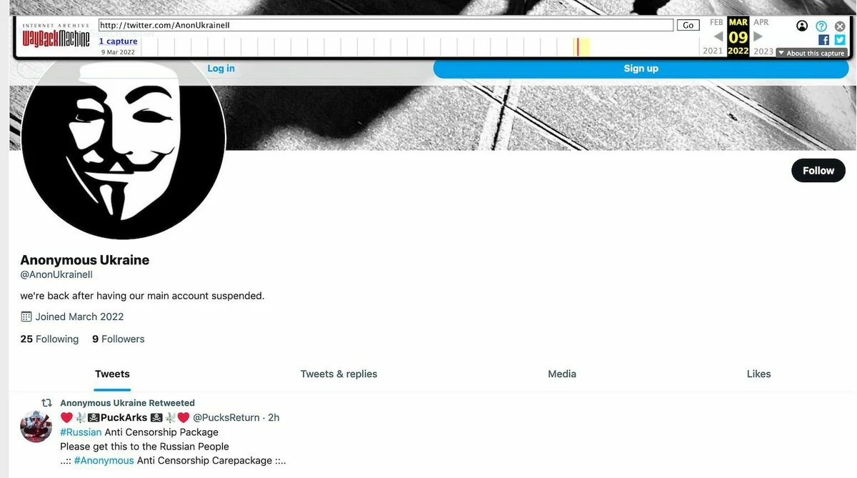 Mit Hilfe der Seite Archive.org kann man nachschauen, wie der Twitter-Account ursprünglich aussah. Name: „Anonymous Ukraine“, das Benutzerbild ist die ikonische Guy Fawkes-Maske. „Wir sind zurück, nachdem unser Haupt-Account gesperrt wurde“, steht in der Bio.