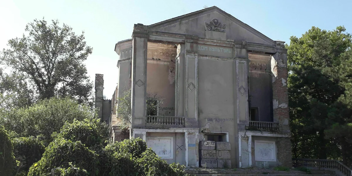 Auch wenn der Putz bröckelt, sehen die Wände des Kirchenschiffs wuchtig und stabil aus. Doch der Eingang hinter der breiten Vortreppe ist mit Betonquadern abgesperrt. Durch die Lücken kann man sehen, dass das Dach fehlt und sich die Natur den Innenraum zurückgeholt hat. Es grünt und blüht, wo einst Kirchenbänke standen. Über dem Eingang steht auf Russisch „Kulturhaus“ geschrieben.