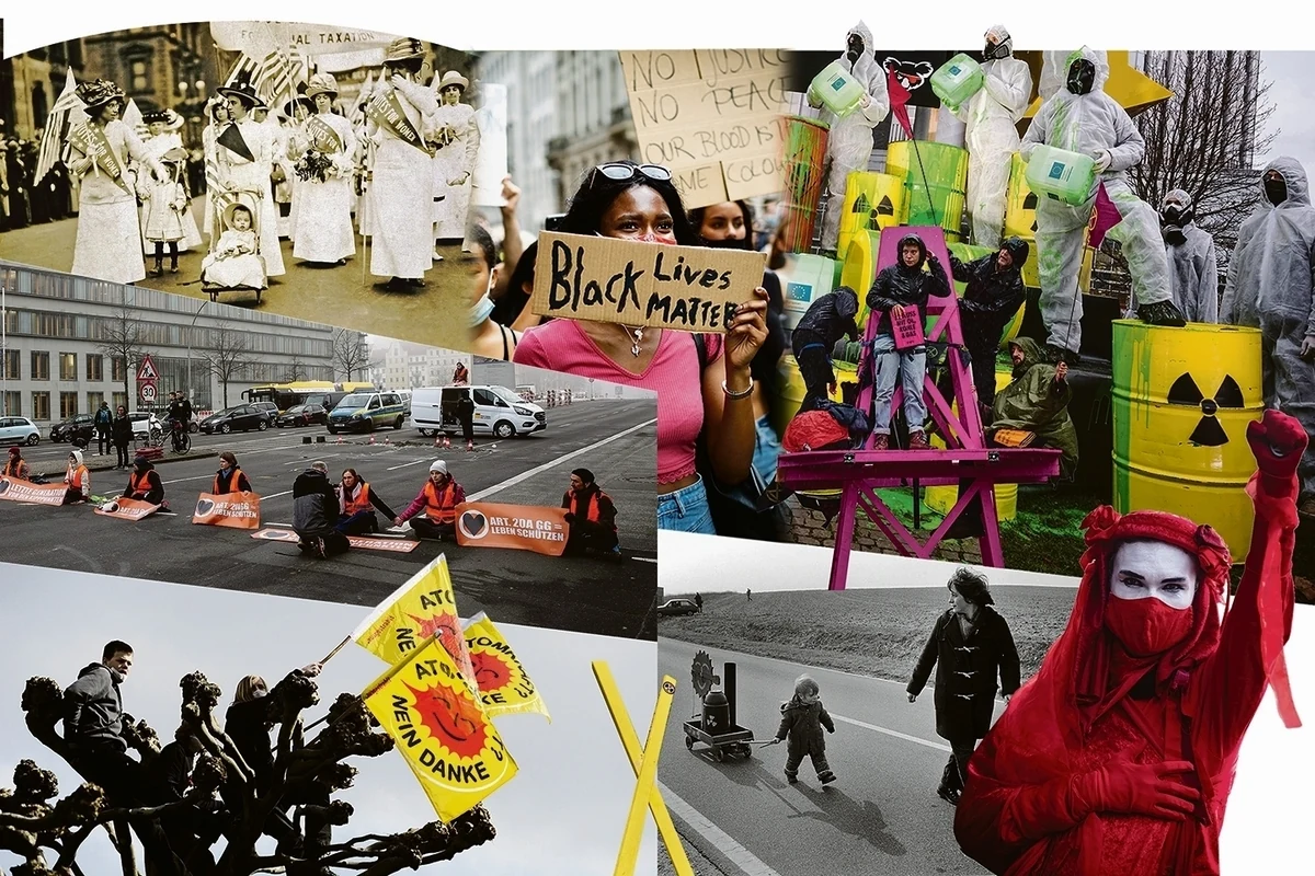 Ob sie erschöpft waren? „Das war keine Kategorie“, antwortet Sander, noch lapidarer. Das klingt freudlos, aber das war es nicht, dagegen spricht bereits der Tomatenwurf. Spaß, Spektakel oder schlicht etwas gerne tun, diese Grundsätze zogen sich bereits durch die Aktionen der Suffragetten, deren Karikatur sich bis heute scheußlich gut hält. Das Prinzip lebt weiter im Gorleben-Treck – dem Protestmarsch gegen Kernenergie 1979 – und in der Freien Republik Wendland mit ihrem Passwesen, in den giftig-bunten Brunnen von Extinction Rebellion und in den Picknicks von Parents for Future auf den Straßen der Innenstädte.