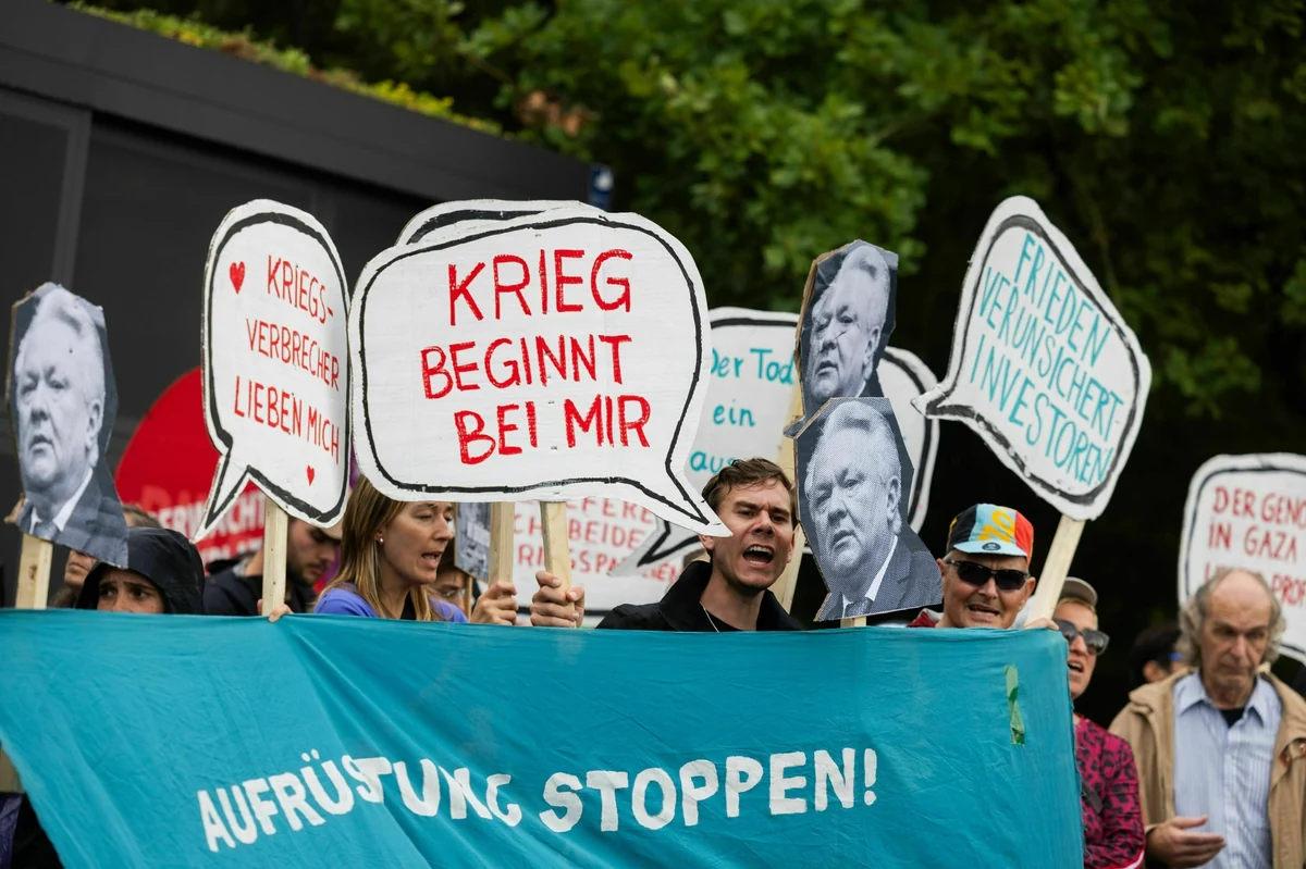 Gegen Mittag machten sich hunderte Aktivist:innen mit der Regionalbahn auf den Weg ins Villenviertel Meerbusch bei Düsseldorf, um den Protest gegen den Rüstungsriesen Rheinmetall bis vor das Wohnhaus des Konzernchefs Armin Papperger zu tragen. Rheinmetall machte im ersten Halbjahr 2025 einen Rekordumsatz von 4,7 Milliarden Euro und gilt als Profiteur der deutschen Aufrüstung.