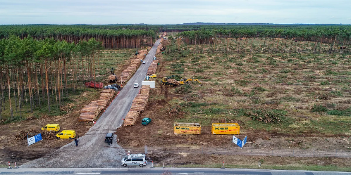 Im Wald haben die Harvester gezeigt, was in ihnen steckt. Der Container für die Pförtner, eben noch kiefernumstanden, ragt aus einer Brache. Binnen zweier Tage haben die Maschinen die Hälfte der 90 Hektar gefällt, die für die erste Ausbaustufe vorgesehen ist. Die Stämme ruhen auf Stapeln. Die Harvester allerdings ruhen nun auch.