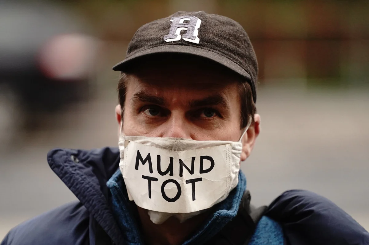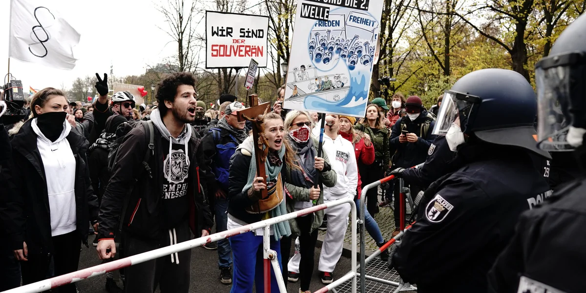 Der Mann ist nicht allein. Der Ton ist noch einmal schärfer als bei früheren Protesten. Wurde dort Frieden und Freiheit eingefordert, wird nun vielfach „Widerstand“ und „Wir sind das Volk“ skandiert. Polizisten werden als „Schergen“ und „Volksverräter“ beschimpft, Journalisten als „Lügner“. Einige Demonstranten tragen Schilder mit Bildern von Angela Merkel oder Drosten und der Aufschrift „Schuldig“. „Wir werden die Stadt heute fluten“, ruft ein Redner vollmundig. „Wir dulden nicht, dass dieses Gesetz durchgedrückt wird.“