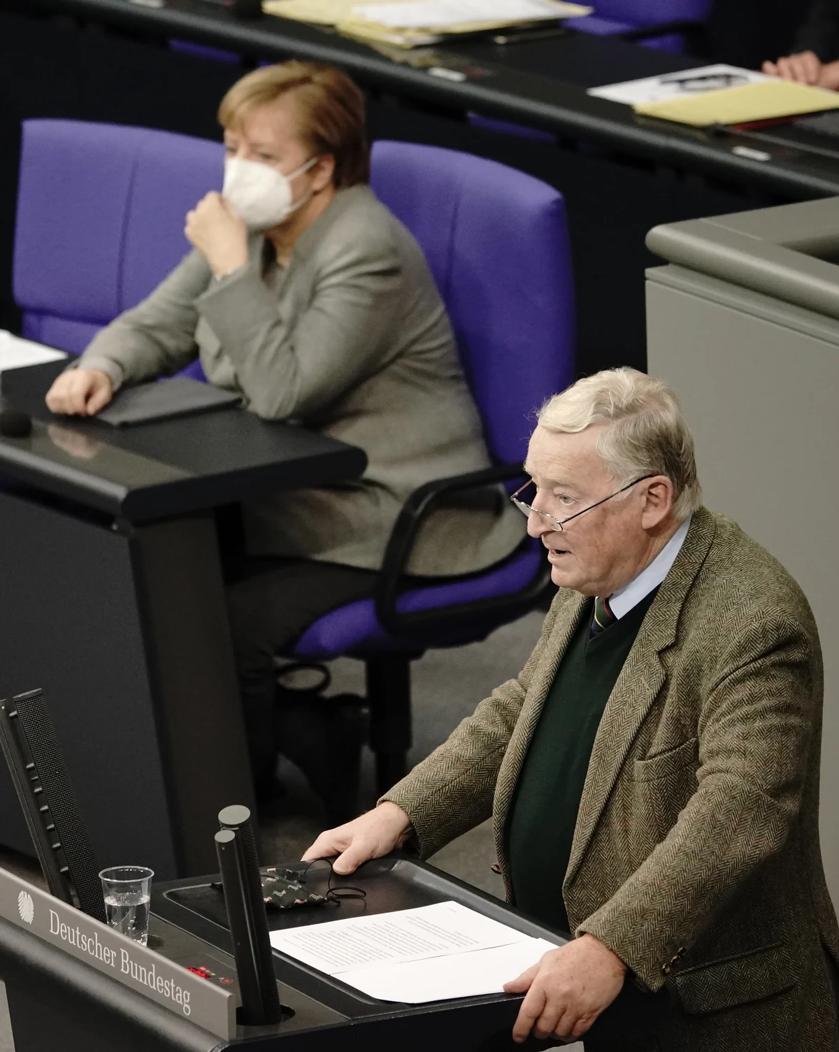 „Das Infektionsschutzgesetz ist die größte Einschränkung der Grundrechte in der Geschichte der Bundesrepublik“, kritisiert Gauland und bringt in einem Halbsatz dann doch noch unter, dass das alles auf eine Diktatur hinauslaufen könne. Auch lobt er die Demonstranten vor dem Bundestag. „Sie treten für ihre Grundrechte ein und müssen nicht vom Verfassungsschutz beobachtet werden“, ruft Gauland in den Saal. Dann aber spricht er von den existenziellen Ängsten von Restaurantbesitzern und Künstlern, warnt vor staatlicher Überwachung wie in China und einer „indirekten Impfpflicht“. Die Abgeordneten seiner Fraktion applaudieren ihm stehend.