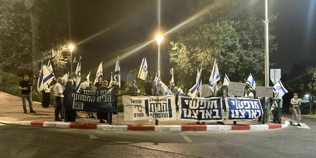 Zwar dominieren die Bilder der Massenproteste in Tel Aviv und Jerusalem die Berichterstattung, aber der Widerstand reißt auch an vielen kleinen Orten nicht ab. In Efrat versammeln sich an diesem Augustabend peu a peu gut 50 Menschen. Sie tragen israelische Flaggen und haben blau-weiße Banner aufgehängt. Auf einem steht: „Links und rechts gegen die Zerstörung.“
