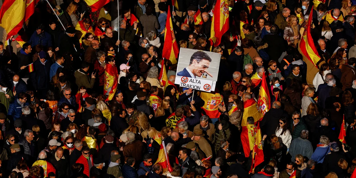 Sánchez gilt der Rechten deshalb als „Vaterlandsverräter“ und „Lügner“. Seine Regierung würde „Spanien ruinieren“ und an „Kommunisten“ – in Anspielung auf den linksalternativen Koalitionspartner Unidas Podemos – sowie an „Kriminelle und Terroristen“ – die katalanischen und baskischen Parteien – ausliefern. Ja, die Regierung sei selber „kriminell“ und „illegitim“. So stand es auf den Transparenten.
