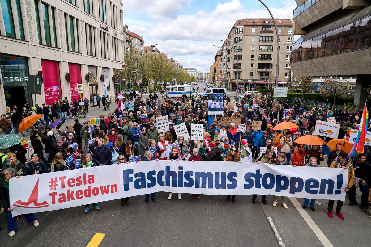 Berlin Die Proteste gegen Tesla nehmen in Europa weiter Fahrt auf. Am Wochenende protestierten hunderte Aktivist:innen der Kampagne „Take down Tesla“ gegen den US-Autobauer vor Tesla Stores in den Niederlanden, Großbritannien und Deutschland, ebenso vor der US-Botschaft in Berlin. Sie forderten einen Boykott des Elektroautoproduzenten, dessen Chef Elon Musk US-Präsident Donald Trump berät und in Europa rechtsgerichtete Parteien wie die AfD unterstützt.
