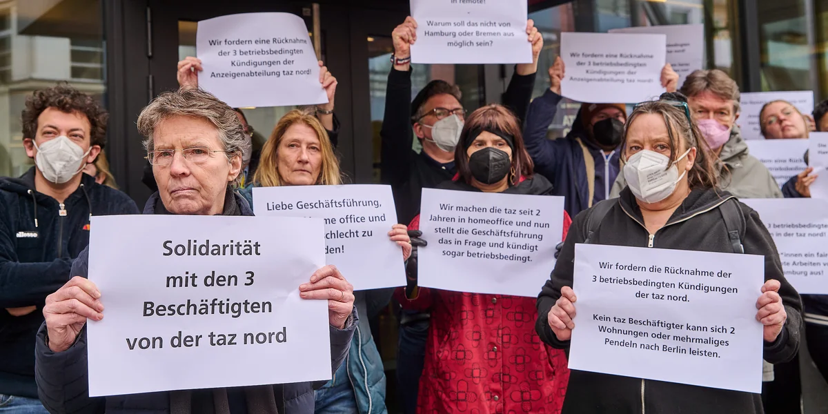 Die taz hat drei Anzeigenverkäufer:innen in Hamburg und Bremen gekündigt. Auf einer Kundgebung wehren sich ihre Kolleg:innen in Berlin.