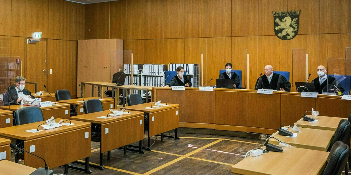 Die Richterin liest am Donnerstagvormittag in Saal 1, Gebäude E des Oberlandesgerichts in Frankfurt am Main vor, was Polizeibeamt:innen während einer Kontrolle am Abend des 11. Februar bei Franco A. gefunden haben. Franco A. ist der Bundeswehroffizier, der seit Mai 2021 wegen der Vorbereitung einer schweren staatsgefährdenden Gewalttat, sprich Terrorismus, vor Gericht steht. Danach werden Fotos der Orden, Binden und Kokarden per Beamer auf eine Leinwand projiziert. Ob er sagen wolle, was das sei, fragt der Vorsitzende Richter Christoph Koller den Angeklagten bei einem mit goldenem Eichenlaub umkränzten Hakenkreuz auf rotem Grund.
