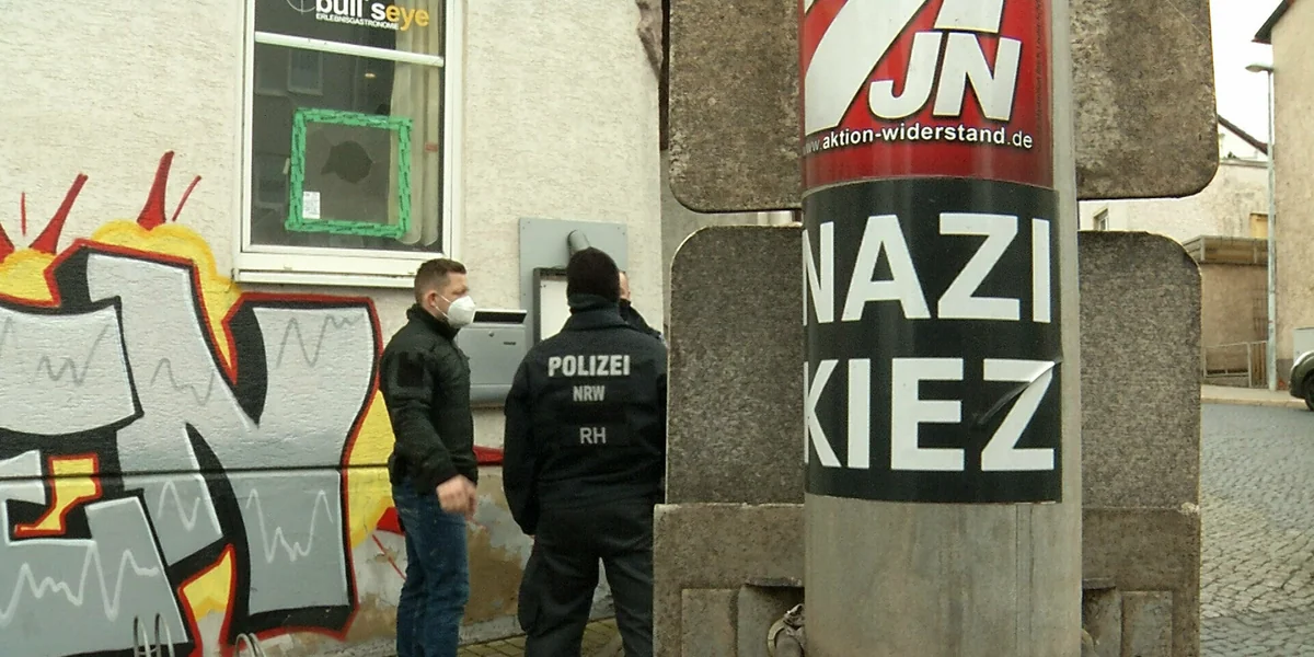 Zwei Polizisten stehen vor einer rechtsextremen Szenekneipe in Eisenach, Thüringen Foto: Martin Wichmann/dp