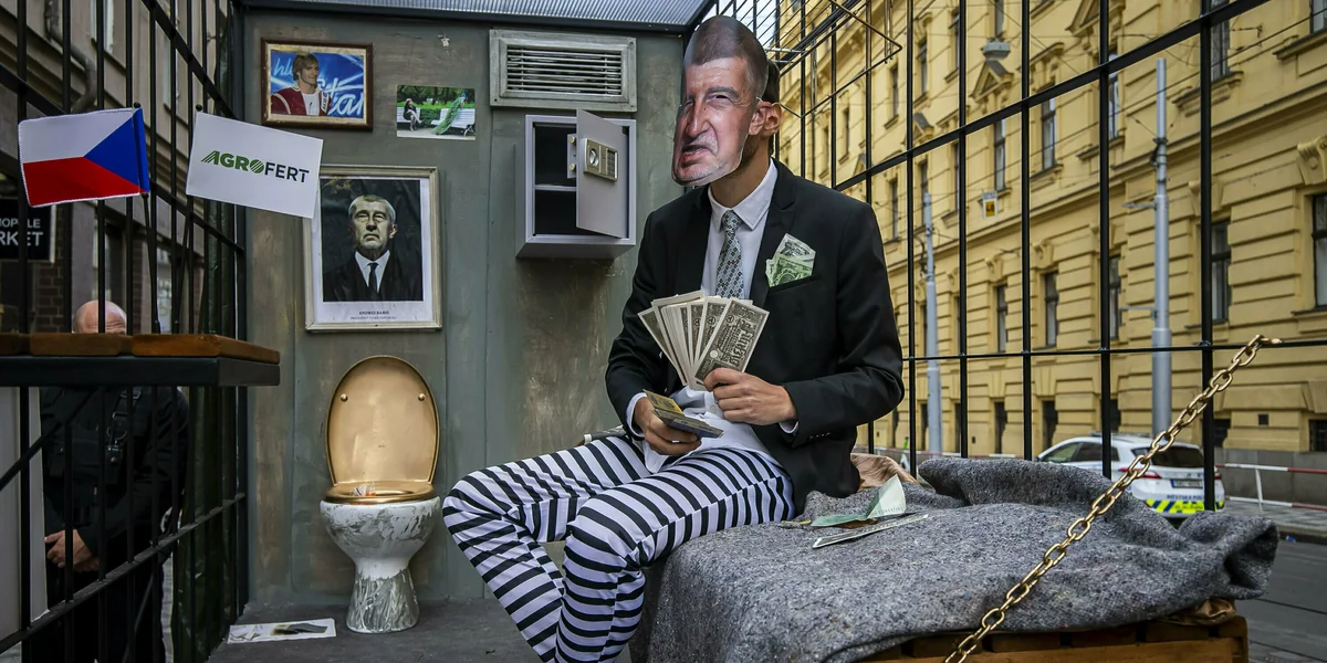 Auf sein persönliches Grauen trifft Tschechiens Ex-Ministerpräsident schon davor: Politaktivisten der Bewegung „Eine Million Augenblicke für die Demokratie“ zeigen sich vor dem Gericht in Karnevalslaune und warten mit Käfig und Gefängnispritsche dem angeklagten Oligarchen auf. Der betritt gegen 8 Uhr zusammen mit seiner ehemaligen Angestellten Jana Nagyová, mit der er die Anklagebank teilt, das Gerichtsgebäude.