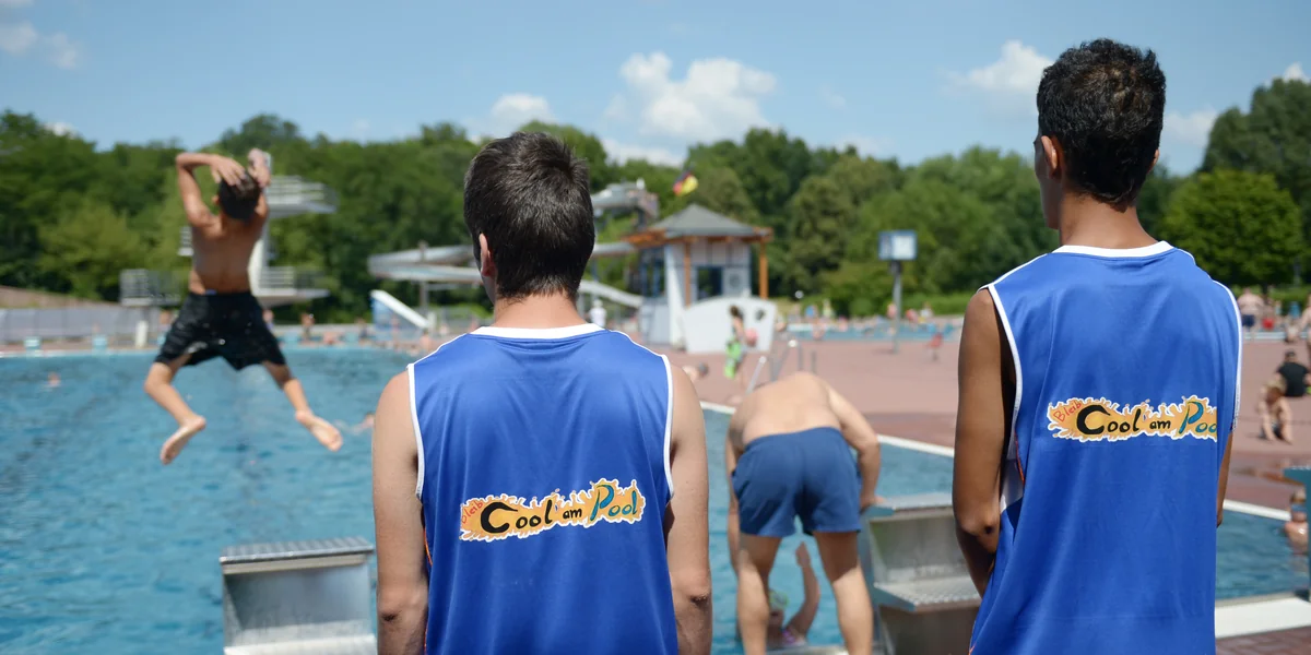 Da kommen drei junge Erwachsene angeschlendert, sie tragen blaue T-Shirts mit der Aufschrift „Bleib cool am Pool“ – als informierte Lokaljournalistin weiß ich, dass dies ein Jugendprojekt zur Gewaltprävention in Sommerbädern ist. Eine von ihnen, offensichtlich die Anführerin, stoppt das Karussell und sagt zu einem vielleicht dreijährigen Steppke, der vor Vergnügen quietschend seinen nackten Popo auf den Sitz presst: „Du gehst dir jetzt erst mal ne Badehose anziehen.“