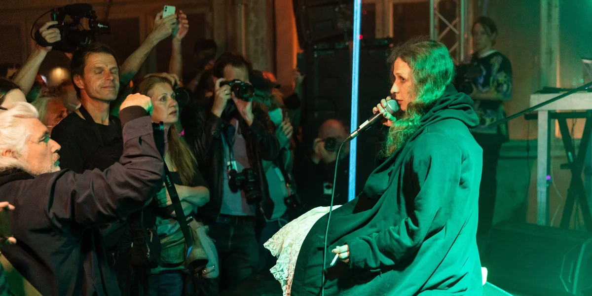 Man nimmt sie auf diesen Bildern nicht als Opfer wahr, sondern sieht die Kraft, die aus ihrem Verharren dort entsteht. Eine starke Setzung am Anfang des Pussy-Riot-Konzerts, dessen Erlöse in die Ukraine-Hilfe fließen, um minderjährige Geflüchtete und ein Krankenhaus vor Ort zu unterstützen.