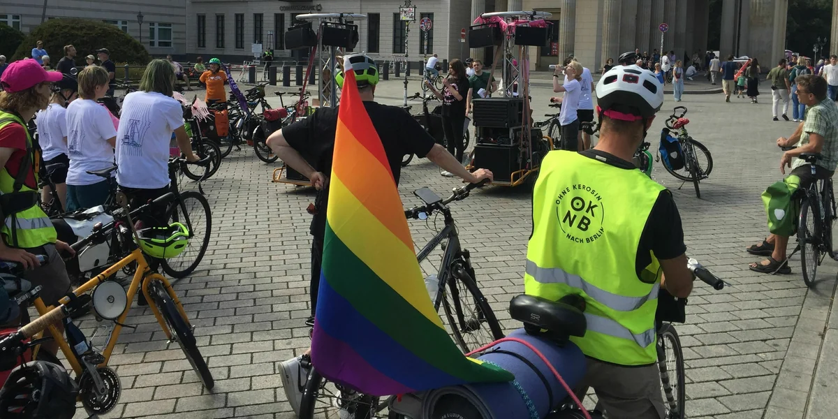 Nach der Auftaktkundgebung am Pariser Platz, zwischen Touris und fundamentalistischen Christ*innen, ging die bunte Demo mit lauter Musik, Seifenblasen und demonstrativ guter Laune Richtung Großer Stern und weiter zum Messedamm. Die meisten Teilnehmenden gehörten den veranstaltenden Organisationen oder dem ADFC an, ein Grüner machte Wahlwerbung für sich selbst. Die Hälfte trug neckische pinke Käppis, auch ein „Landtagswal“ aus Pappmaschee und eine Discokugel begleiteten die Demo.