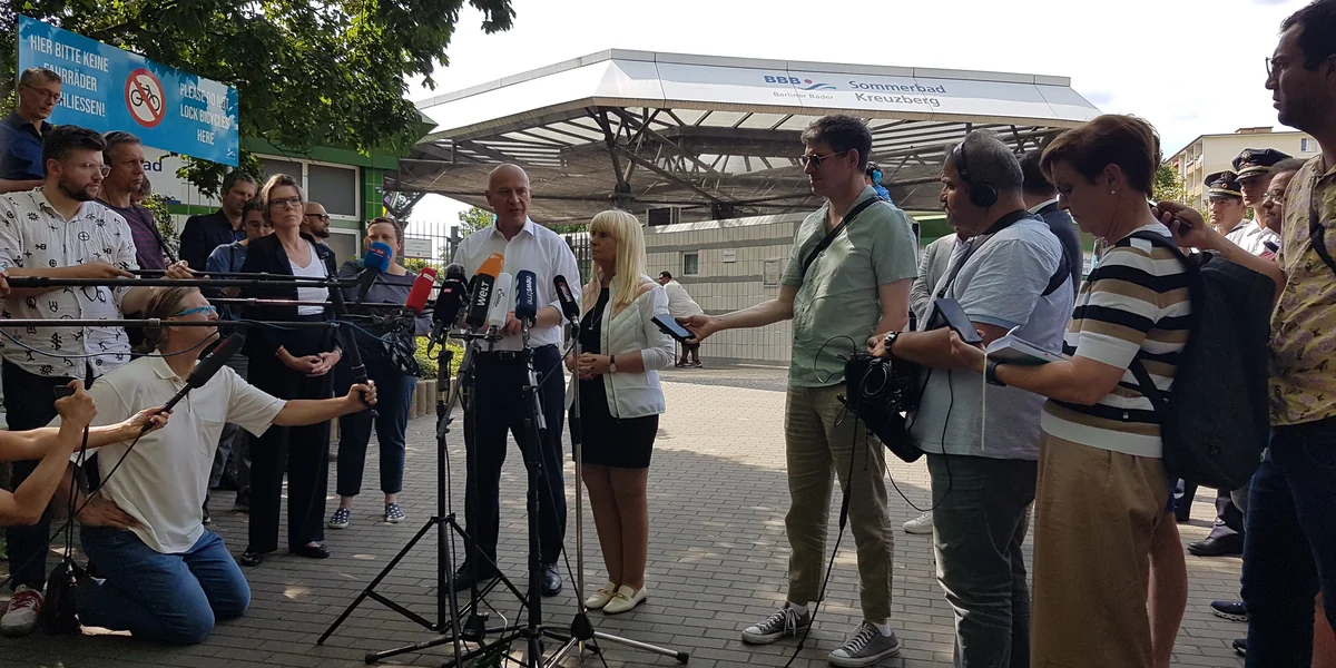 Auf dem Vorplatz des Bades findet im Anschluss eine Pressekonferenz statt. Bei solchen PR-Terminen kriege sie immer die Krise, stöhnt eine Kollegin. „Aber wir sind wie immer alle hier“, sagt eine andere Journalistin selbstironisch. In eine Front von Kameras sprechen Spranger und Wegner ihre Erkenntnisse, die schon vor dem Badbesuch festanden: Jeder Freibadbesucher werde künftig beim Ticketkauf namentlich registriert, müsse seinen Ausweis oder ein Schülerdokument vorzeigen.