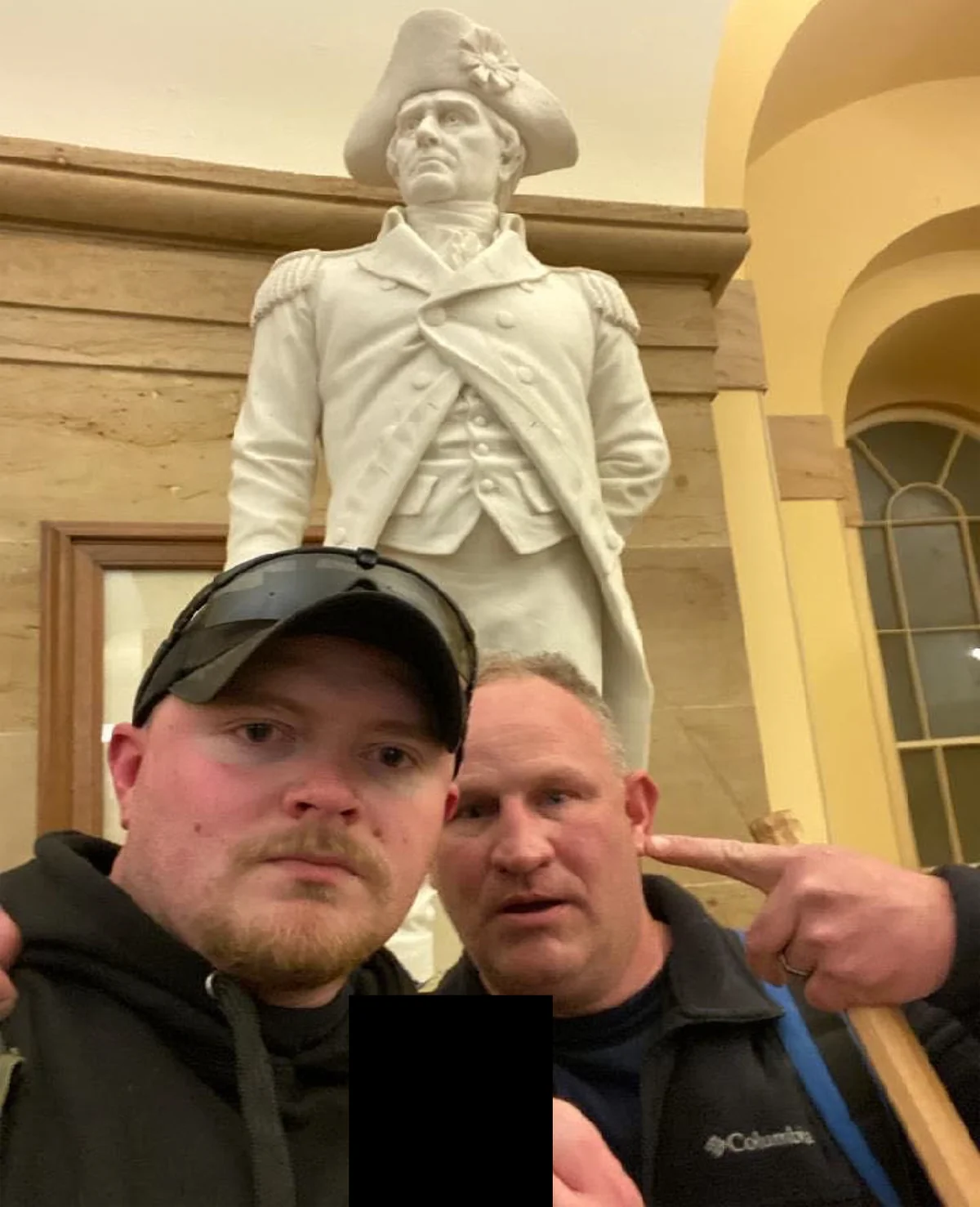Am 6. Januar waren die beiden kommunikativer. Thomas Robertson und Jacob Fracker informieren ihre Kollegen in Rocky Mount live aus dem Kapitol über ihre Leistungen. Ein Selfie zeigt sie triumphierend vor einer Statue von John Stark, General im Unabhängigkeitskrieg, der den Satz geprägt hat: „Frei leben oder sterben“. Fracker hat den Mittelfinger erhoben. „Die Linken sind nur sauer, weil wir tatsächlich die Regierung angegriffen haben“, schreibt Robertson auf seiner Facebook-Seite, „die Rechten haben das fucking Kapitol an nur EINEM TAG eingenommen.“