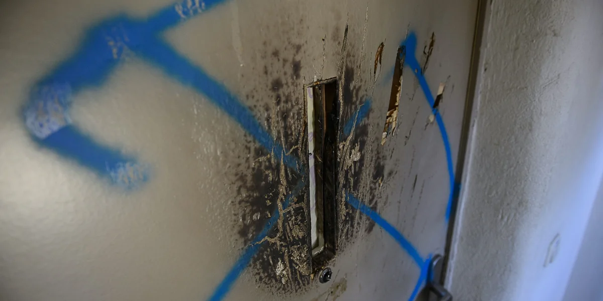 Wenn man die Wohnung heute aufsucht, sind die Spuren des Angriffs noch deutlich zu erkennen. Von außen ist ein riesiges blaues Hakenkreuz über die Tür gesprüht, in der Mitte befinden sich schwarze Brandspuren, mehrere tiefe Löcher sind in das Holz geschlagen. Dort, wo früher die Glasscheibe war, klebt jetzt ersatzweise eine Plastiktüte vom Discounter um die Ecke. Im Treppenhaus sind einige Stellen frisch gestrichen, mehrere Nachbarn erzählen, dass sich auch dort Hakenkreuze befanden. Im Erdgeschoss steht der Schriftzug „HooNaRa“ an der Wand – für Hooligans, Nazis und Rassisten. Ob Thomas F. auch diesen zu verantworten hat, ist unklar.