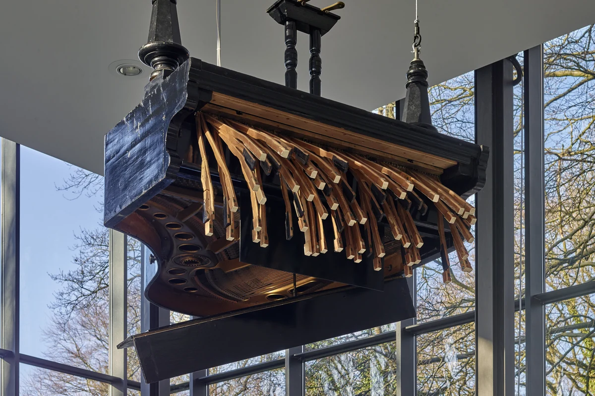 Ungleich spektakulärer und sowieso längst ikonisch ist in der mittleren Halle die Installation „Concert of Anarchy“ aus dem Jahr 2006. Geräuschvoll dekonstruiert sie einen kopfüber von der Decke hängenden Konzertflügel, indem sie deren Tasten mithilfe pneumatischer Zylinder ruckartig aus dem Instrument herausfahren lässt, als wollten sie zu Boden stürzen und dabei die Saiten im Korpus des Instruments zu einer kreischenden Kakofonie anschwellen lassen.