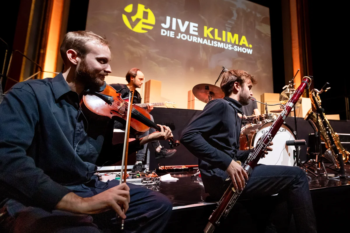 Bei der Reihe „Jive“, die auf Kampnagel in Hamburg zu Gast war, präsentieren Journalistinnen und Journalisten ihre eigenen Recherchen live einem Publikum. Hinter „Jive“, das setzt sich aus Journalismus und live zusammen, steht die gemeinnützige Organisation Headline. 2016 haben sie mit Journalismus-Slams á la Poetry-Slam begonnen und 2023 kamen dann die Journalismus-Shows mit Orchester dazu. Ein „Bühnenmagazin“, so nennen sie das.