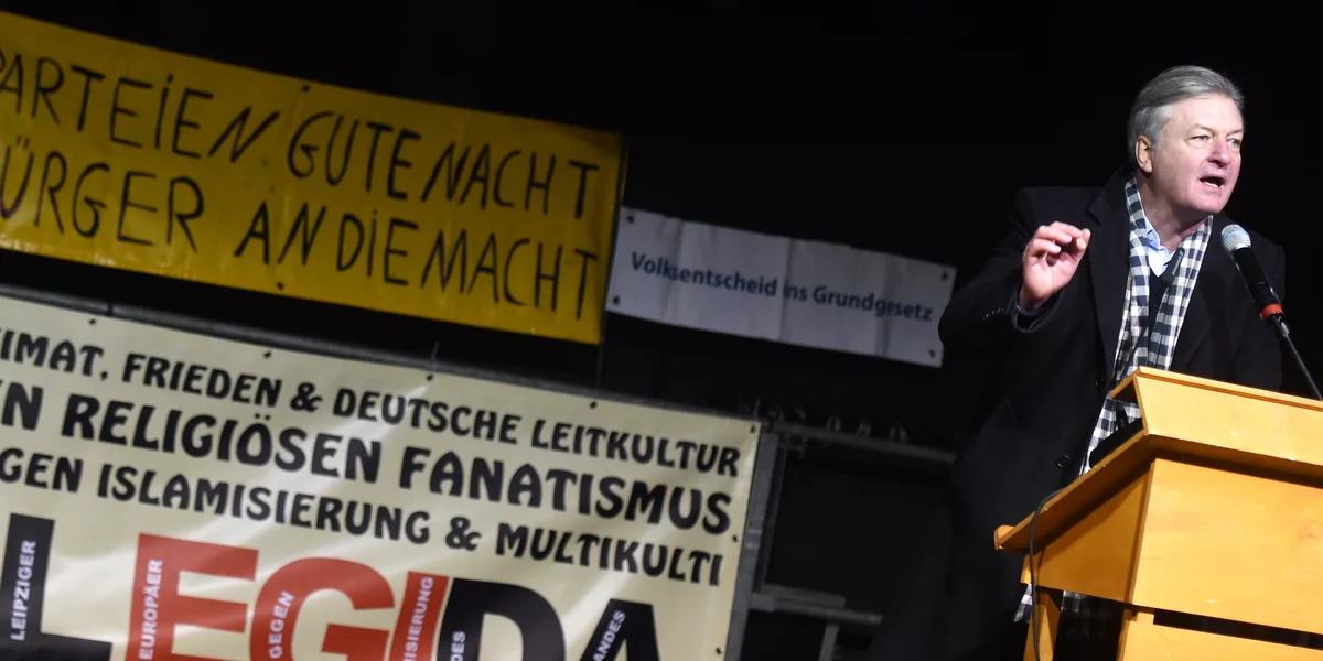21. Januar 2015: Jürgen Elsässer spricht bei „Legida“. Foto: dpa