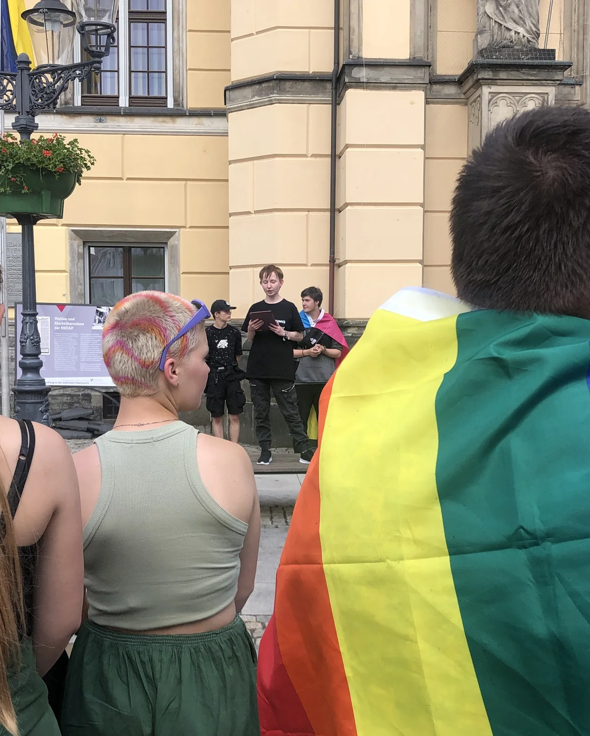 Auf dem warmen Kopfsteinpflaster des Marktplatzes hocken Alena, Lothar und Johanna. Sie warten darauf, dass noch eine siebte Flagge dazu kommt. Um 18 Uhr an diesem Montag soll Oberbürgermeister Thomas Zenker zum Kick-off des diesjährigen Christopher Street Days am wichtigsten Gebäude der Stadt die Pride-Flagge hissen. Die Stimmung ist trotzdem so mittel. Es ist der Tag nach den Wahlen. Wahlkater.