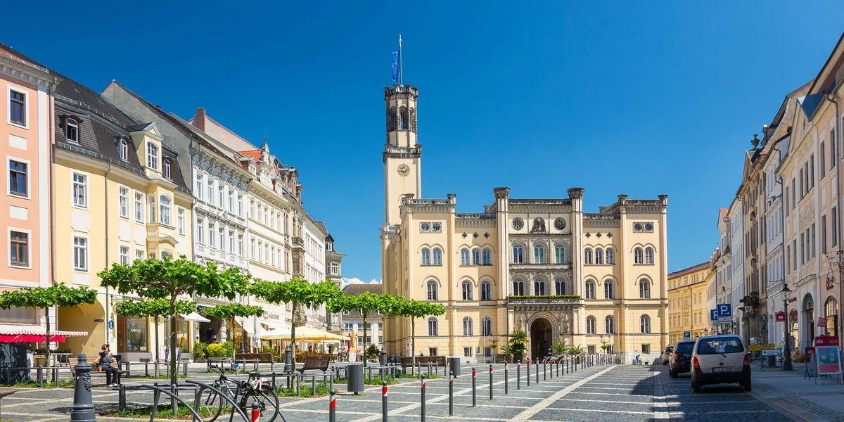 Noch ist es ruhig rund um das Zittauer Rathaus. Der Neorenaissancebau wirft lange Schatten in der Nachmittagssonne, ein paar wenige Passant:innen sind unterwegs, zu hören ist das Klackern von Ösen gegen die Fahnenmaste. Sechs Flaggen hängen insgesamt vor dem Torbogen des Rathauses: EU, Bundesland Sachsen, Landkreis Görlitz auf der einen Seite, Tschechien, Polen und Deutschland auf der anderen Seite. Die 25.000-Einwohner-Stadt liegt im Dreiländereck, Europa ist hier fußläufig.