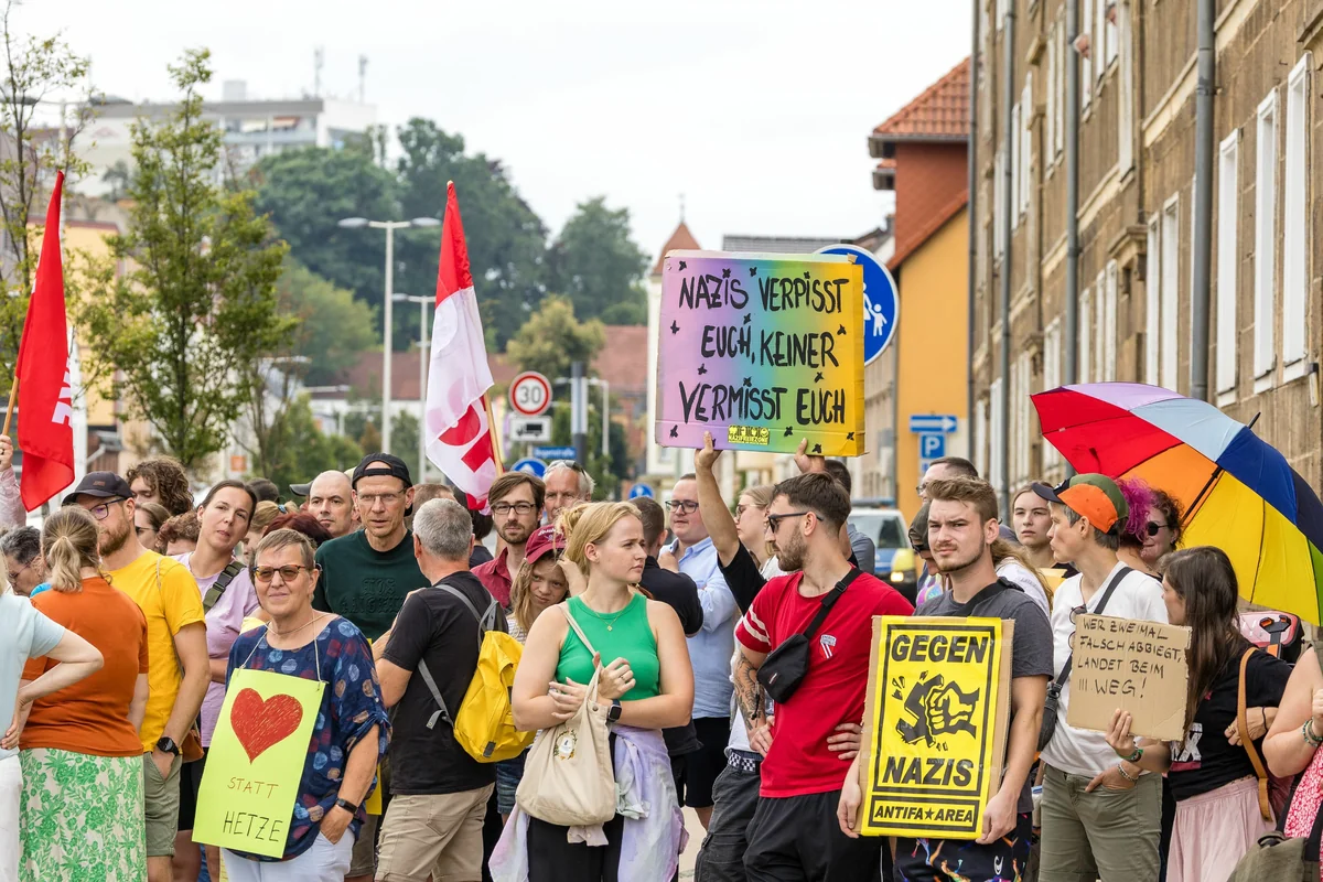 „Aktuell erleben wir, wie Neonazis und Faschisten ihre völkischen Fantasien in unsere Stadt tragen und vor allem junge Menschen vereinnahmen wollen“, sagte Bündnisleiterin Bianca Broda. „Wir stellen uns dem heute entschieden entgegen.“