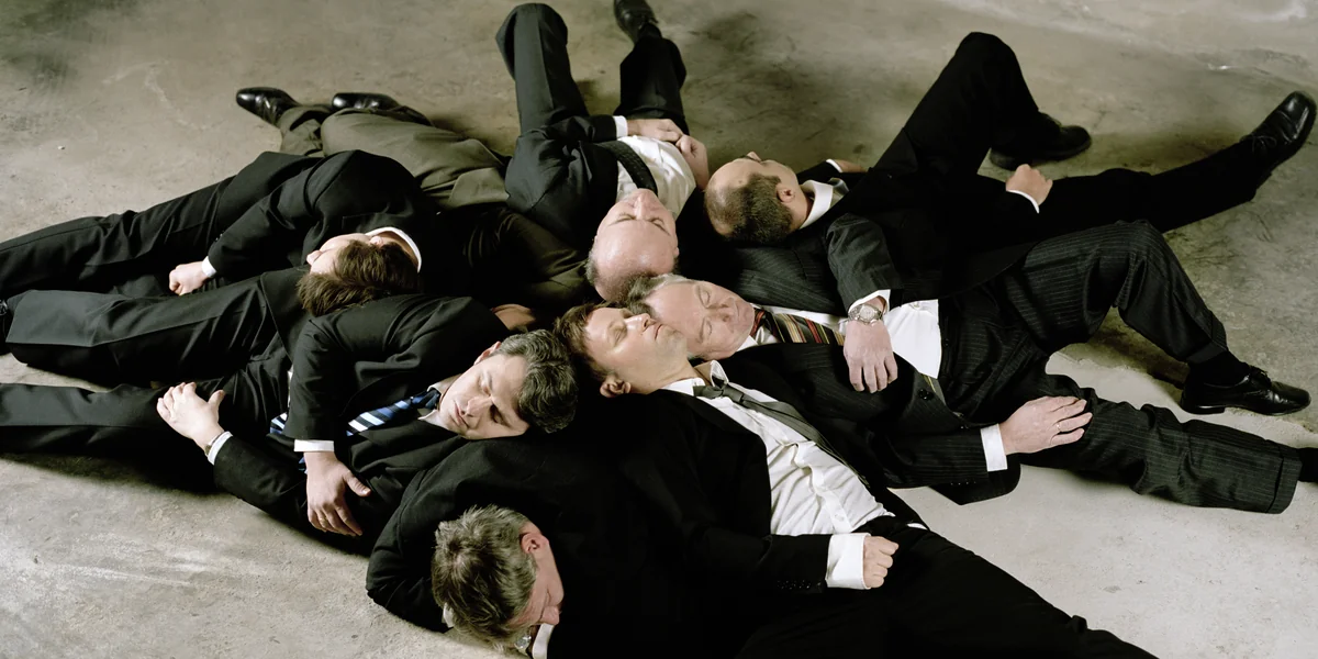 Wie sie daliegen, Krawatten verrutscht, Augen geschlossen, übereinander gerutscht wie schlaffes Gemüse, machen sie nicht mehr viel her, die Herren in ihren weißen Hemden und dunklen Anzügen. Sind es Immobilienmakler, Politikberater, Versicherungsvertreter? Schlafen sie betrunken nach einer Party, liegen sie erschossen nach einem Anschlag? Alles möglich auf der Fotografie, die Oliver Ressler unter dem Titel „We Have a Situation Here“ inszeniert hat. Eindeutig scheint nur das Uneindeutige der Situation, das Ende der gesicherten Verhältnisse, die theatralische Inszenierung, die zu Spekulationen reizt.