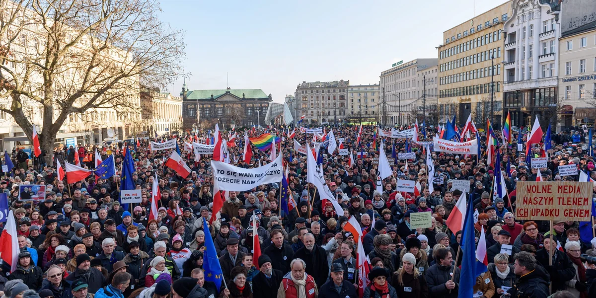 Allein in Warschau versammelten sich am Samstag laut Stadtverwaltung etwa 20.000 Demonstranten vor dem öffentlich-rechtlichen Rundfunk TVP. Zu den Kundgebungen hatte das Komitee für die Verteidigung der Demokratie (KOD) aufgerufen. Auch in Berlin demonstrierten Unter den Linden auf einen KOD-Aufruf hin nach Teilnehmerangaben dutzende Menschen gegen den Kurs der polnischen Regierung. „Es gibt keine Demokratie ohne freie Medien“, war auf einem Plakat zu lesen.