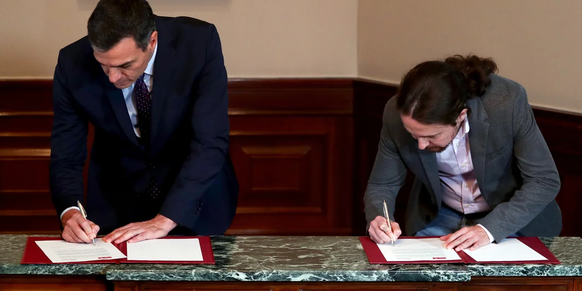 Der geschäftsführende spanische Premier und Chef der sozialistischen PSOE, Pedro Sánchez, und der Chef der linksalternativen Unidas Podemos, Pablo Iglesias, haben am Dienstag im spanischen Parlament einen vorläufigen Koalitionsvertrag unterzeichnet.