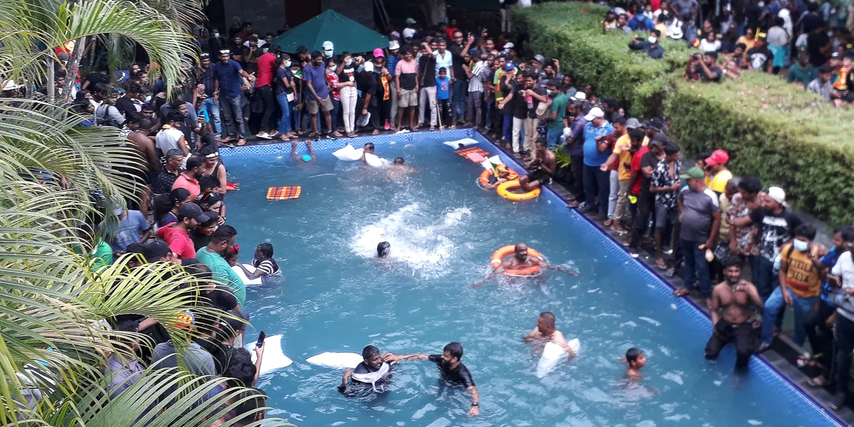 Teilweise mit Schwimmreifen und in T-Shirts plantschen Menschen im Luxuspool. Aber es ist nicht irgendeine Villa in einem der besten Viertel von Sri Lankas Hauptstadt Colombo, die sie sich ausgesucht haben und die als Videokulisse im Netz viral geht. Hunderte Menschen haben über das Wochenende den Präsidentenpalast, also den offiziellen Wohnsitz des sri-lankischen Staatsoberhaupts Gotabaya Rajapaksa eingenommen.