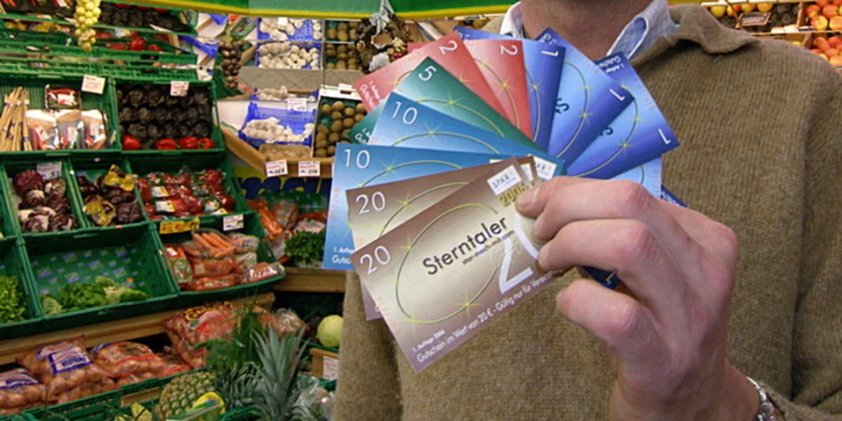 Der Ansatz: Im Berchtesgadener Land gibt es eine weitere Regiowährung: den Sterntaler. Jedes Vierteljahr verlieren die bunten Scheine zwei Prozent ihres Wertes und müssen durch eine Aufklebemarke aufgewertet werden. "Wenn ich Euro und Sterntaler im Portemonnaie habe, gebe ich natürlich lieber erst die Sterntaler aus", erklärt Initiator Franz Galler, ein früherer Banker.