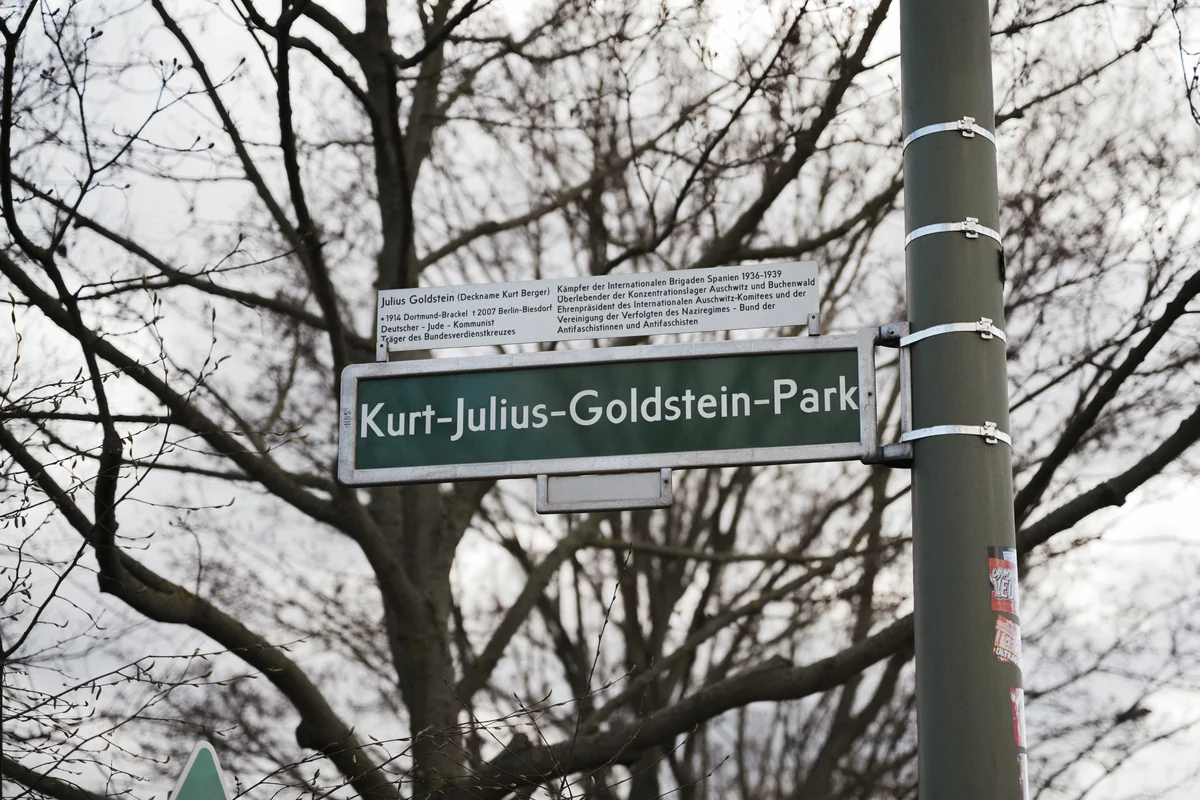 Kurt Julius Goldstein wurde 1914 bei Dortmund geboren. Bereits mit 16 Jahren trat er der Kommunistischen Partei Deutschlands (KPD) bei. 1933 konnte er sich seiner Verhaftung durch die Nazis entziehen und ging über Luxemburg und Paris nach Palästina. Ab 1936 kämpfte er im Spanischen Bürgerkrieg als Soldat der kommunistischen Internationalen Brigaden gegen die Putschisten um den späteren Diktator Francisco Franco. Nach dem Sieg der Faschisten wurde Goldstein in einem französischen Lager interniert und 1942 an die Nazis ausgeliefert. Er überlebte Auschwitz und Buchenwald und schwor gemeinsam mit anderen Befreiten den Schwur von Buchenwald. „Wir stellen den Kampf erst ein, wenn auch der letzte Schuldige vor den Richtern der Völker steht.“ 1951 zog er in die DDR, wo er Intendant des Radiosenders „Stimme der DDR“ war. Er engagierte sich ein Leben lang gegen das Vergessen und wurde dafür mit dem Bundesverdienstkreuz geehrt. Er starb 2007. Drei Jahre nach seinem Tod wurde ein Park in Berlin-Hellersdorf nach ihm benannt. Goldstein hatte fünf Söhne. René Goldstein ist sein jüngster Sohn.