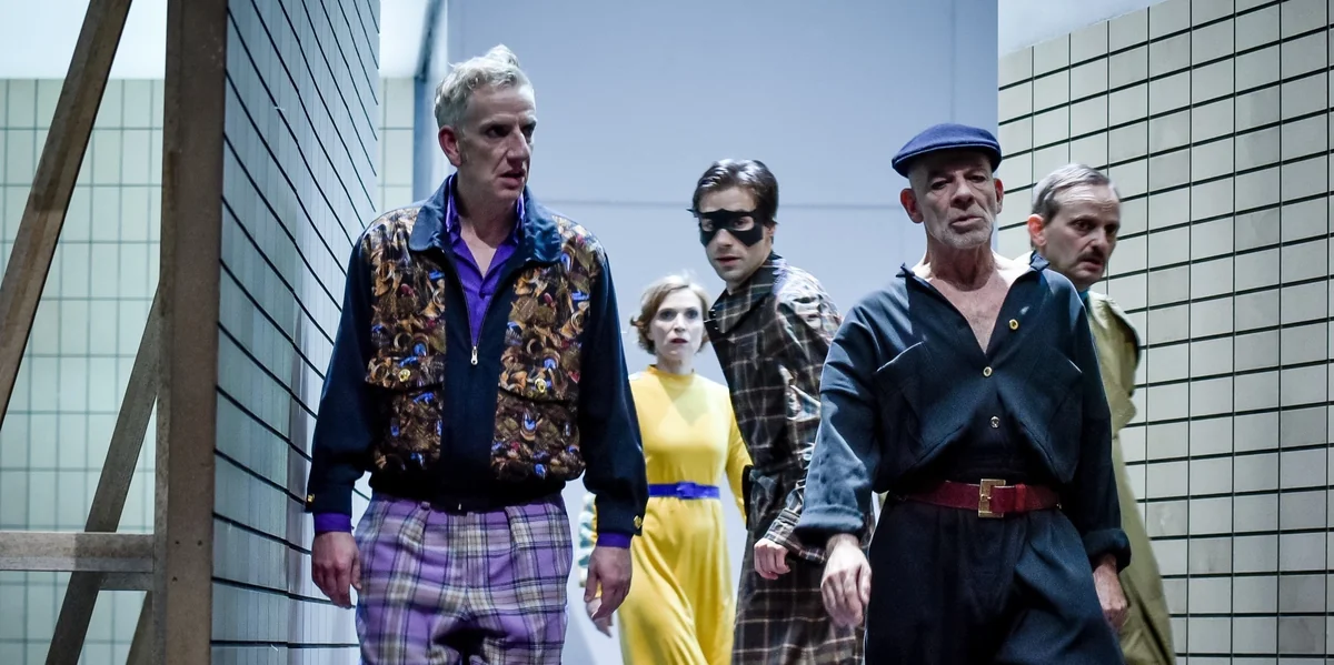Es ähnelt einem riesengroßen frisch gepressten, erfrischenden Mega-Orangensaft, was Pollesch alles aus der Straßenszenen-Idee herausquetscht. Mal stecken drei der Performer*innen in bunten kleinen Pappautokostümen und geben der Straßenszene damit eine neue Konnotation: „Einen Unfall als Auto nachspielen ist doch eher ein Kostümfilm“, verkündet Wuttke. Mal wird mit den Bildassoziationen gealbert, die sich (zumindest manchen) aufdrängen, wenn die Automenschen mit den Pappmaché-Metall-Armen wedeln: „Ich bin kein Performer, ich bin Transformer!“