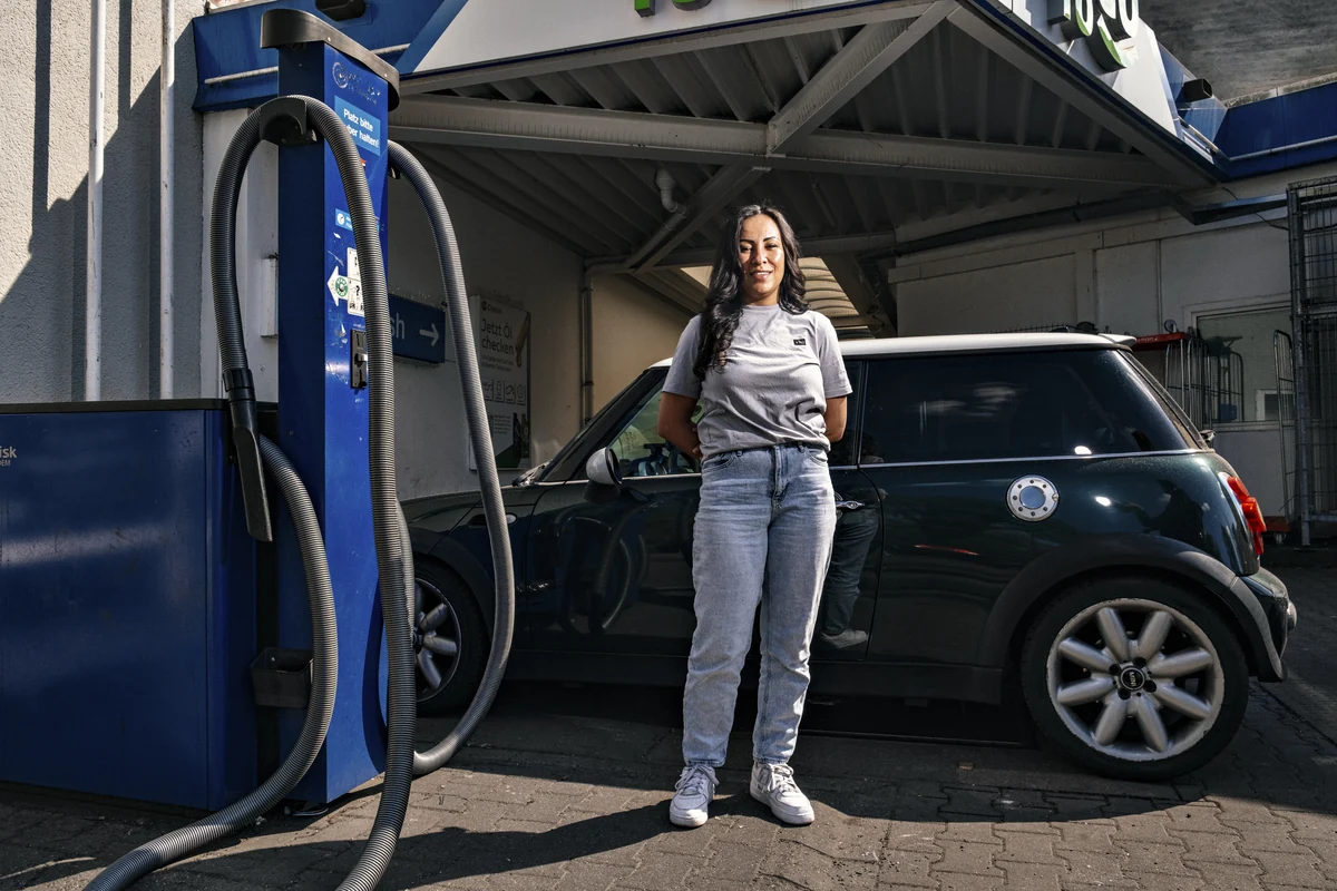 Nour steht jetzt am Zapfhahn und blickt sich Hilfe suchend um. Tanken, das musste sie in der Fahrschule nie machen. Sie fragt um Rat: Welche Sorte soll sie nehmen?